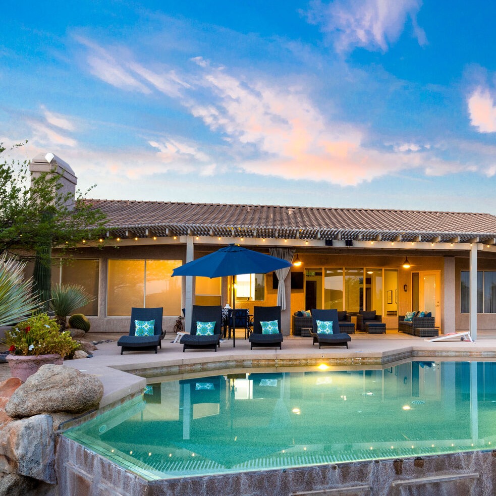 Whether you’re planning a family vacation, a golf trip, or a romantic couples getaway, this home offers beauty and comfort that is close to everything yet offers you the space and tranquility to escape it all. Step through the front door and find yourself welcomed by a stylishly updated and beautifully appointed luxury resort home. After an adventurous day on the golf course or enjoying one of the many nearby hiking trails or attractions, you’ll find abundant space in the home to spread out and relax. With a bright and spacious living room and game room, three king-size bedrooms, and a bunkbed room everyone in your group will find a perfect space to come together or to slip away and call their own. The expansive master suite is situated on its own wing offering substantial space and privacy. With six large flat-screen TVs you're never far from the action, including 65” TVs in the living room and pool table room. Step outside the back doors and find yourself surrounded by a beautifully landscaped resort-style yard, complete with a heated and cooled infinity-edge pool, outdoor fireplace, outdoor big-screen TV, outdoor dining table, and abundant lounge seating. Soak up the warm Arizona sunshine in one of the poolside loungers or beat the heat on the warmer afternoons on the oversized shaded patio complete with a professional misting system and dual ceiling fans. After taking in the dramatic AZ sunset, the patio and surrounding backyard come to life with inviting landscape and ambiance lighting so you can keep the enjoyment going into the evening.