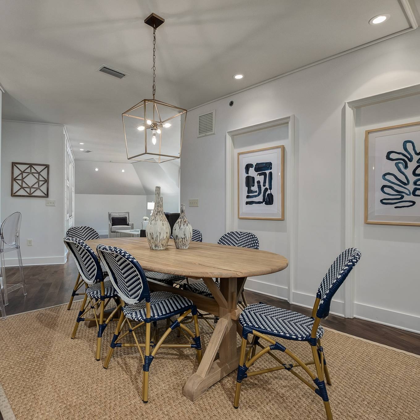 Penthouse city living meets the casual luxury of an elegant beach house at this two-bedroom hideaway in Rosemary Beach. You’ll experience the convenience of being effortlessly close to everything— including four gorgeous pools, dozens of delicious restaurants and casual cafes, eclectic boutique shopping, and a state-of-the-art fitness center. Best of all, the sugary white sandy beach and emerald green water of the Gulf of Mexico is only a five-minute stroll away. The open dining area features a formal dining table with seating for six and a casual bar area with modern acrylic barstool seating for four. The whole area is illuminated by stylish pendant lights. In the kitchen, a full suite of premier Viking appliances creates a chic, efficient space for brewing a simple pot of coffee in the morning to preparing a full dinner on those evenings when you want to stay in. There’s also a laundry room with additional storage options. The two bedrooms are located on opposite ends of the living space and each has an ensuite bath— allowing for plenty of privacy and peace and ensuring a great night’s sleep for all. In the first bedroom, there’s a custom twin-over-queen bunk bed, swivel-mounted HDTV, a full bathroom with a tub/shower combo, and a sun-drenched balcony with a panoramic view. In the primary bedroom suite, you’ll find a sumptuous king-sized bed, HDTV, and another sunny balcony with breathtaking views. In the primary ensuite bathroom, a massive step-in shower with multiple showerheads is the ideal space to rinse off after a sandy day at the beach. With tons of luxurious touches— like gorgeous Grohe faucets and fixtures and Viking appliances— no detail has been overlooked in the design of this sublime penthouse suite. Your family will love the convenience of the central location, yet you’ll enjoy the quiet peace and privacy of being in your own world high above the hustle and bustle below. This soaring hideaway strikes the perfect balance between a chic city retreat and an elegant, laid-back beach house.