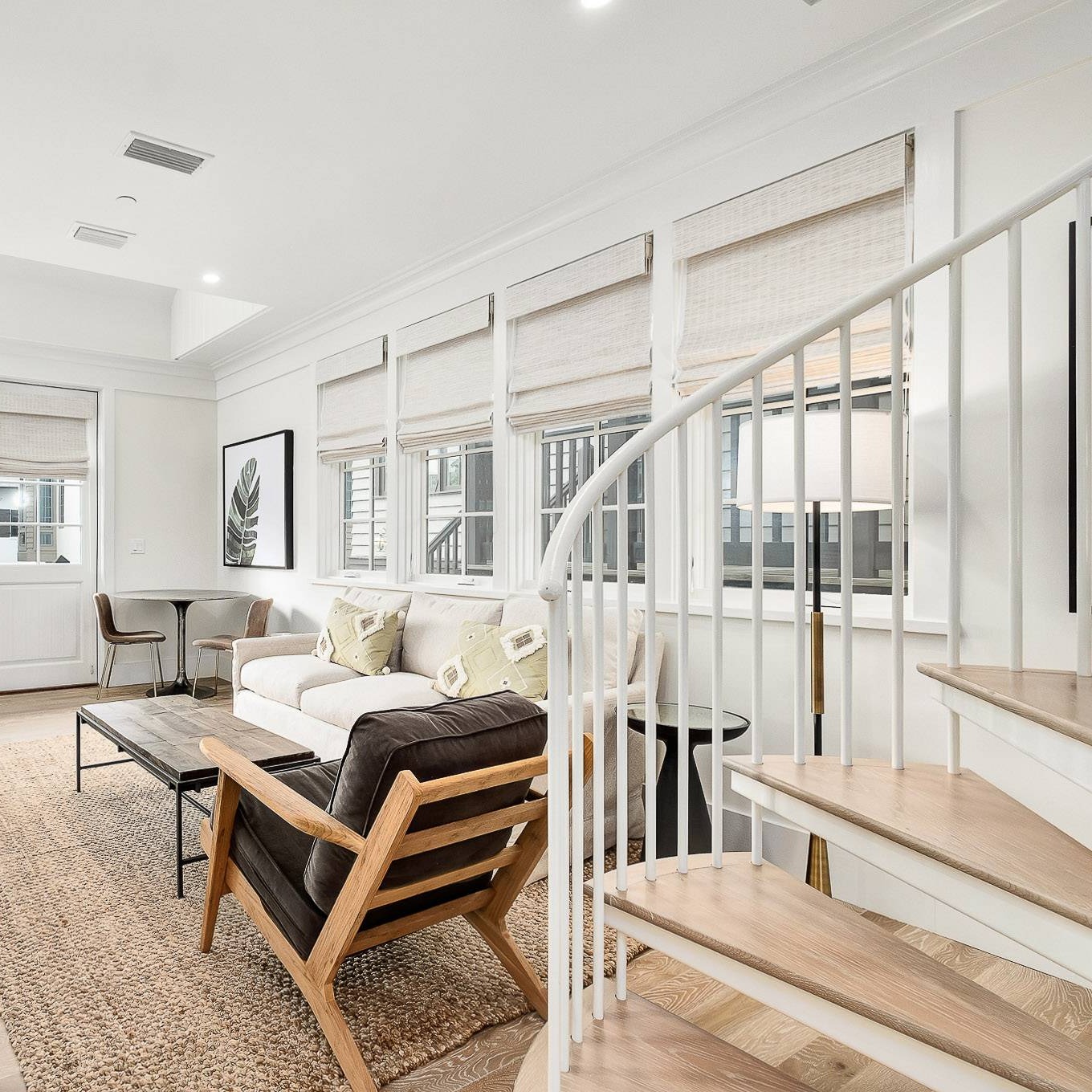 Luxury and elegant minimalism combine in this lovely one-bedroom flat in an exclusive Rosemary Beach neighborhood that places you close to the Barbados Pool and the private beach access point. In Rosemary Beach, the carriage houses are located above the garages and allow for plenty of privacy and lots of natural sunlight. Ideal for couples or small families, Blue Tang Home has space for four and includes a primary bedroom as well as an airy, lofted sleeping area. A cobblestone driveway leads to the stairway that takes you up one flight to the main living area— a bight and open room with crisp white walls and high ceilings. Two walls are made up of windows that let the Florida sunshine flow inside, while custom rattan shades maintain privacy. There’s a comfortable sofa, a velvety soft armchair, and a large HDTV for those nights when you want to stay in with a good movie and a bowl of popcorn.