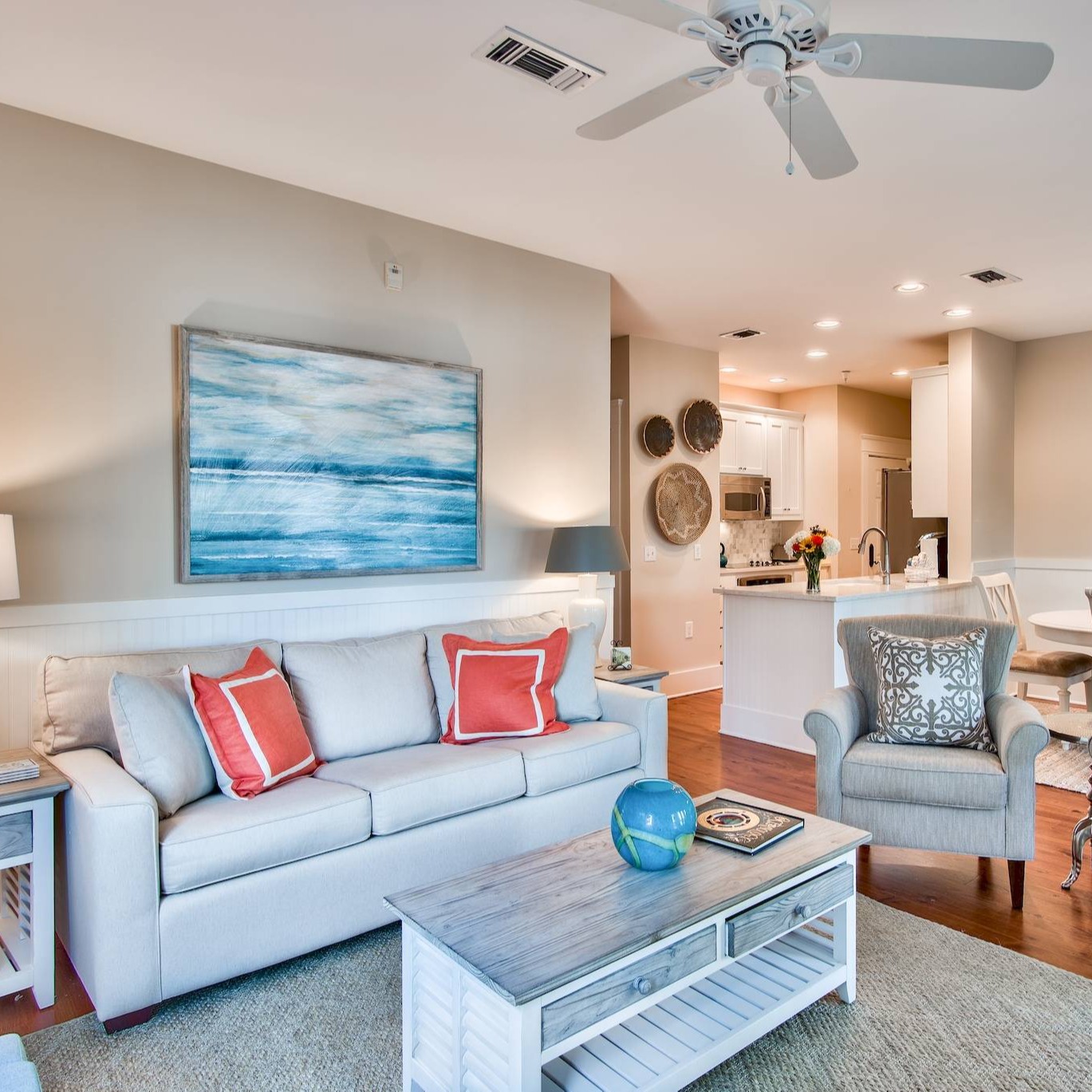Home to West Indies-inspired architecture, foodie-worthy coastal cuisine, secret pathways winding between homes, and a boardwalk promenade, Rosemary Beach will delight your senses. For beach lovers, the white sugar sand beach and gentle clear Gulf waters are legendary. Rosemary Beach offers four community pools scattered throughout the community, available to guests. Offering soothing neutral shades with strategic pops of fun color, Black Marlin Home ensures a comfortable Rosemary Beach stay. The living room is an inviting oasis, with comfortable furnishings and a new Samsung QLED TV, with a Sonos soundbar. In the ultra-modern kitchen, quartz counters, stainless steel appliances, and a tile backsplash add to a sophisticated ambiance. The adjacent dining space accommodates up to six guests, with two additional chairs that are stored away. The elegant main suite offers a king-sized bed, seating area, and TV. An ensuite bath features dual vanities, an oversized walk-in shower, and a stand-alone tub. The guest bedroom is equipped with a queen bed and seating area.