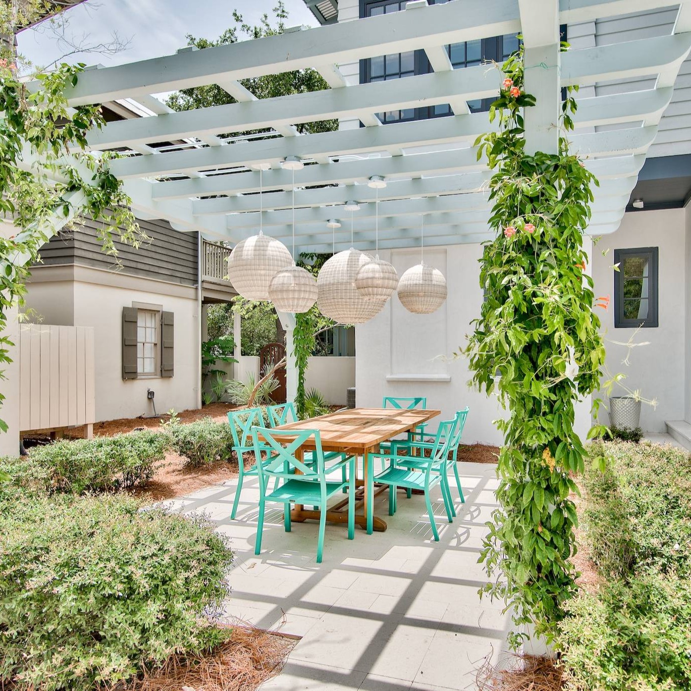 Reminiscent of a casita on the Moroccan seaside, the home’s landmark pointed arches frame a wraparound first-floor porch, where you can relax with a cocktail while walkers and bikers pass by the beach boardwalk adjacent to this home. The newly expanded interior, designed by nationally acclaimed Erika McPherson Powell of Urban Grace Interiors, exudes magazine-worthy luxury and comfort. The open concept living room is furnished with a double chaise sofa, a couch, and six chairs surrounding an expansive coffee table and 65” flat-screen TV. Play cards, relax, or work on a puzzle while you watch football. The gorgeous chefs’ kitchen is every cook’s dream with a Viking range and stove, bacon grill, and Sub Zero refrigerator. Just outside the kitchen is a brand new Weber Genesis II gas grill. Dine inside at the table or al fresco under the gorgeous pergola. This lovely home is located a short walk from the St. Augustine Green, Butterfly Park, and the Cabana Pool.