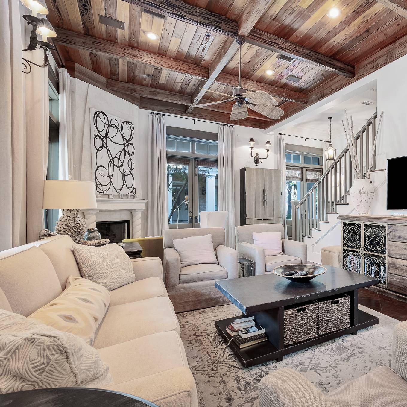 A graceful southern home located just steps from the warm Gulf of Mexico shore, Sea Robin Place has space for the whole family to spread out and relax. With six bedrooms and five bathrooms, even large groups will be completely comfortable here. Surrounded by ample porches, wooden boardwalks, and Adirondack chairs, the home features a chic, remodeled vibe with a laid-back, luxurious style. Park in the garage and walk or bike everywhere from here. The main level is open and airy, with sky-high ceilings and lots of creamy, neutral tones. In the living area, there’s a plush sofa and four overstuffed armchairs surrounding the large HDTV. Overhead, the ceilings are finished in natural wood tones, and in the corner, there’s a cozy fireplace flanked by huge glass doors that allow the natural sunshine inside. A pleasing mix of classic finishes and modern artwork creates a chic space to kick back and recharge. Inspired by elegant southern homes of the French Quarter, the home is surrounded by generous covered porches that are accessible from nearly every room. Your whole group will love serving up cool drinks and relaxing on the veranda while watching the world go by. There’s also an alfresco dining area with an outdoor dining space and a gas grill, as well as an outdoor shower for rinsing off sandy toes. And when it’s time to hit the beach, grab a casual lunch, or indulge in a romantic date night out, you’re only a few steps away from nearly everything Rosemary Beach has to offer.