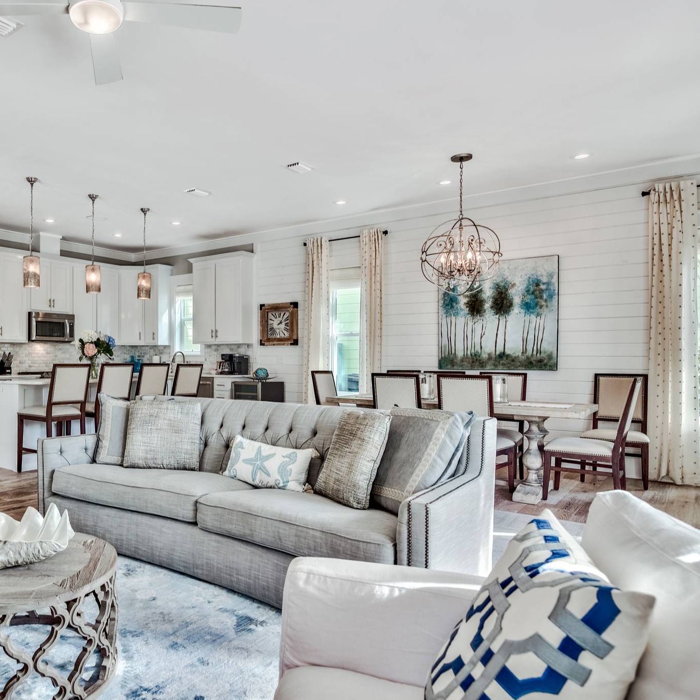 Located in the charming enclave of Seacrest Beach, both tech and luxury lovers will find this to be their ideal vacation home. Just two miles from Rosemary Beach, residents and vacationers alike enjoy the 12,000-gallon community pool and the close proximity of the sugar sand Gulf beach in Seacrest. Security-conscious families will love the extensive smart-home features, including integrated video monitoring, alarm, smart locks, wifi thermostats, and water sensors. Those looking for quality and creature comforts will feel pampered with the on-point design trends throughout the home. Originally conceived as a part-time residence, Blue Crab House is furnished to an elegant standard not commonly seen in vacation homes. With four bedroom suites, this vacation home is a perfect choice for multiple couples or multi-generational families traveling together, with each enjoying the privacy of their own space. Natural light is abundant throughout, offering the feeling of bringing the outside in. Multiple decks offer a quiet respite to enjoy a few pages in your book, a beverage, or perhaps just the morning sun on your face. The gas grill brings everyone together for the time-honored tradition of the family barbecue. The family gourmet will be thrilled to see the spacious, state-of-the-art kitchen, featuring stainless steel appliances and quartz counters. The center island is both beautiful and functional, with elegant pendant lights and seating for four.