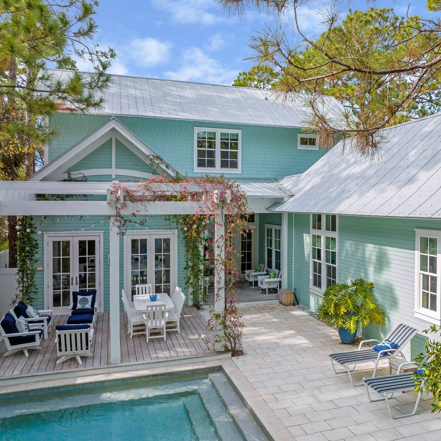 On a private wooded lot that’s a short stroll away from the sugary sand of the beach lies this exquisite modern farmhouse that’s the same color as the turquoise Gulf of Mexico waters. Lakewood House is a magnificent oasis that’s ideal for large groups and families looking for the perfect place to call home while they relax by the shore. With over 3,000 square feet, multiple living spaces, four gorgeous bedrooms, and a heated private pool, guests are sure to love this slice of Gulf Coast paradise. The cobblestoned driveway welcomes you home and has parking for up to six vehicles. Once inside, the main level great room is completely open and features soaring high ceilings, seafoam green walls, and blond wood floors. In the living area, there’s a comfortable sofa and two wingback armchairs facing the fireplace. Around the corner lies a media room with two sleeper sofas, two swivel chairs, and a huge 75“ 4K TV. The sofa, chairs, and Sonos sound system make this spot ideal for catching the game or family movie night. In the great room, there’s a formal dining table with space for eight illuminated by an elegant, sparkling chandelier that highlights the unique barrel vault ceiling. Next to the dining area is the kitchen, complete with a spacious island with seating for four. The classic white cabinets surround a full suite of premier appliances— including two GE Monogram wall ovens, a gas range with a griddle, a spacious refrigerator, a dishwasher, and a microwave drawer. There are multiple outdoor living spaces— including a meditation terrace and a pergola-covered porch with a teak table for alfresco dining. French doors off of the great room lead outside to the backyard and the zen-like heated swimming pool that’s surrounded by swaying palm trees and tropical flowering vines. Every single detail has been thought of and provided- including a large laundry room, lightning-fast Wifi, and even an outdoor shower.