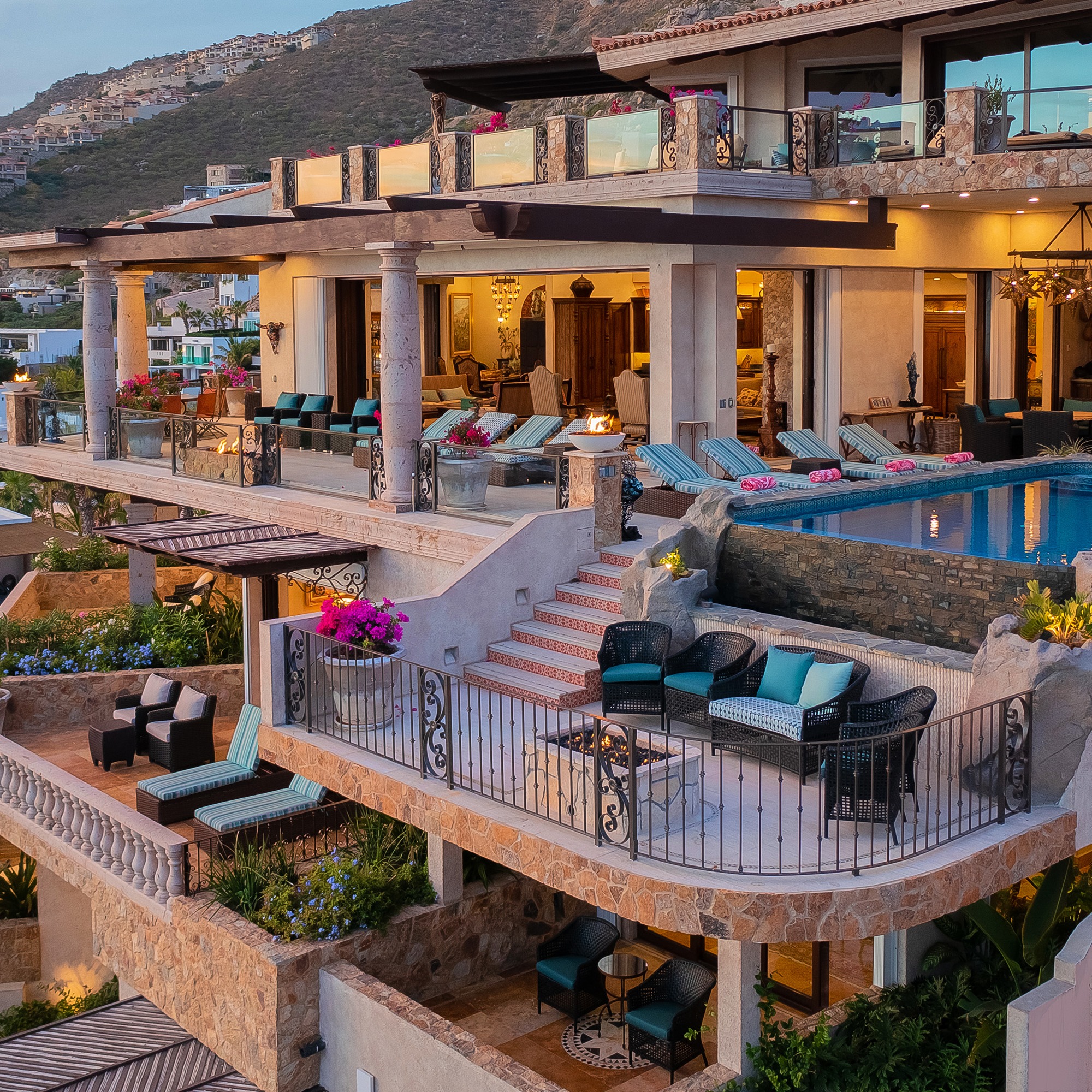 Cerrada del Sol Manor features multiple levels of scenic terraces offering enchanting ocean and mountain views. This glamorous luxury home has an appealing blend of stunning architecture, exceptional amenities, and an excellent location in Cabo’s private Pedregal community. Whether you relax in one of the two swimming pools, sip a drink at your swim-up bar, unwind in one of the two jacuzzis (both) with a waterfall, or gather with friends for conversation at sunset next to one of 4 fire pits, you’re in for the vacation of a lifetime at this spectacular retreat. You and your guests will be captivated by the attentive eye for design throughout this beautiful vacation home, with handcrafted details throughout including granite counters, elegant furnishings (including several antique pieces), original artwork, and a waterfall wall. Enjoy your ocean-view exercise room situated in one of the guest rooms, an indoor-outdoor spa room, billiard, and shuffleboard tables. Settle into one of the poolside lounge chairs to take in the panoramic views of the Pacific Ocean from your luxurious escape. Add the services of a private chef or in-villa spa massages to make your stay even more memorable. With downtown Cabo San Lucas, the marina, and world-class activities just minutes away, you’ve found a perfect taste of paradise.